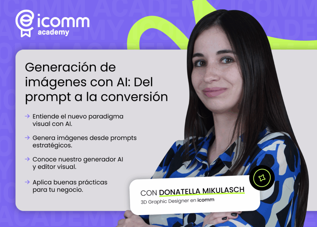 Para acompañar esta evolución, desde icomm academy lanzamos el curso “Generación de Imágenes con AI”, dictado por Donatella Mikulasch, 3D Graphic Designer en icomm.